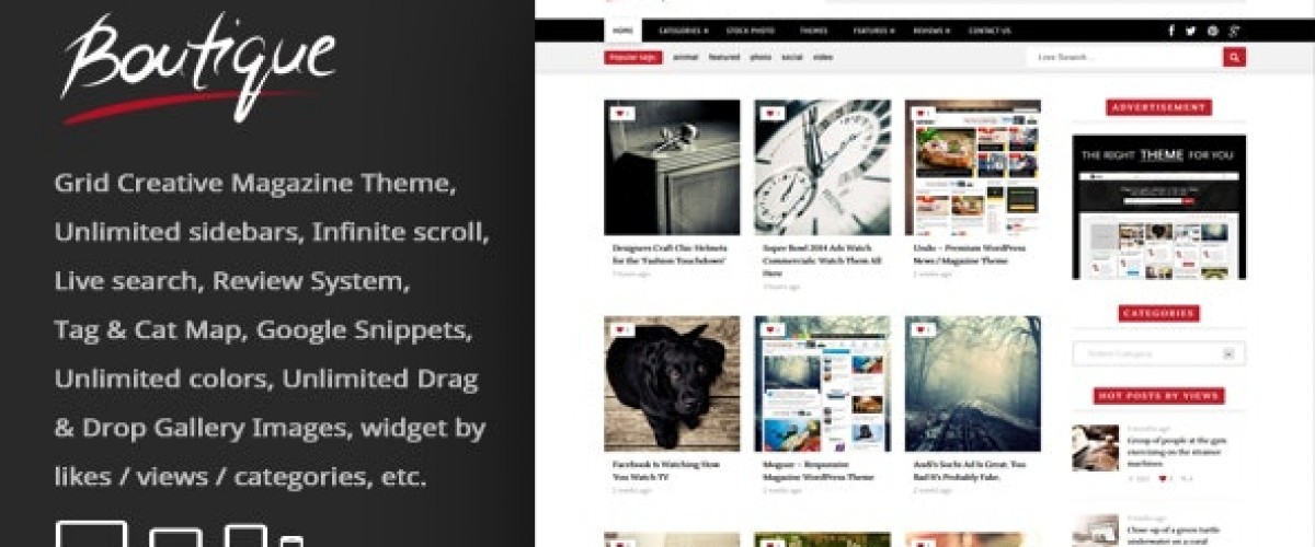 Boutique Grid Premium WordPress Theme is a professional Creative Magazine WordPress Theme with a remarkable clean layout design suitable for any type of site. Created with love using the latest HTML5 and CSS3 techniques, completely responsive to look perfectly in all mobile devices, easily usable with any device as well as PCs. Don’t take my word without looking at the demo.