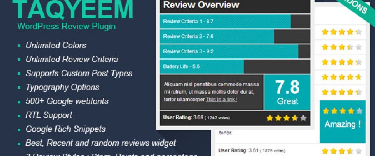 Taqyeem is a premium reviewing and rating WordPress plugin … This plugin was built for adding lovely ratings and reviews to your posts, pages, and custom post types. Use the customization options to create the perfect ratings addition to your website. Change the fonts, image, colors, style, and of course the criteria.