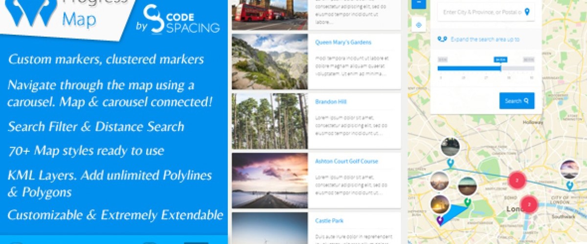 Progress Map is a wordpress plugin for location based listings. The aim is to help users having websites like hotel listings, real estate listings, restaurant listings, job listings, store listings & more… to list their locations on Google map and to easily navigate through the map using a carousel.