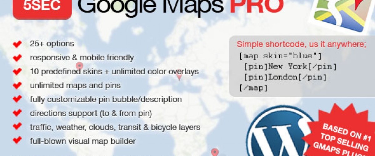 Visual map builder will help you create maps with multiple pins in seconds fully responsive and mobile friendly 10 predefined map skins + unlimited color overlays directions to and from pin address 15 predefined pin icons + custom ones info layers – traffic, transit, weather, clouds, bicycle