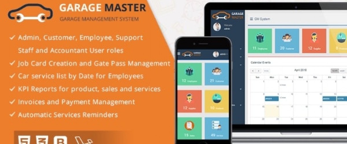 Admin, customer, emplyee, support staff and accountant user roles, Job card creation and gate pass management, car service list by date for emplyees, invoice and payment management, automatic service reminders.